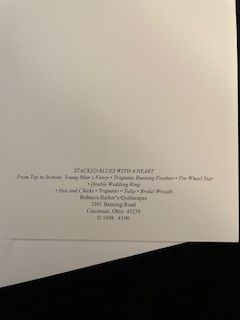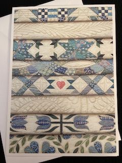 STACKED BLUES WITH A HEART blank inside card w/ envelope. From top to bottom: Young Man's Fancy, Trapunto Running Feather, Pin Wheel Star, Double Wedding Ring, Hen and Chicks, Trapunto, Tulip, Bridal Wreath. Rebecca Barker's Quiltscapes. c1998 #100
