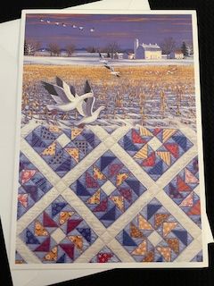 FLYING GEESE QUILTSCAPE blank inside card w/ envelope. This quilt pattern is one of many with the same name but they all use triangles to represent geese or birds in flight. This pattern is attributed to Michael James. He wrote The Quiltmaker's Handbook in 1978. The earliest "flying geese" patterns were developed around the turn of the 19th century. Rebecca Barker's Quiltscapes. c1998 #126