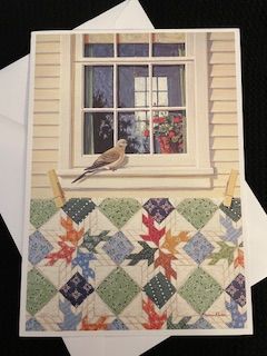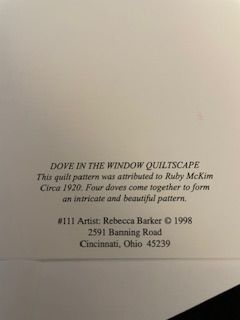 DOVE IN THE WINDOW QUILTSCAPE blank inside card w/ envelope. This quilt pattern was attributed to Ruby McKim Circa 1920. Four doves come together to form an intricate and beautiful pattern. Rebecca Barker's Quiltscapes. c1998 #111