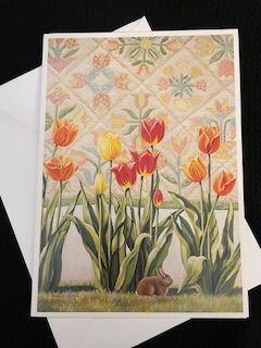 THE TULIP QUILTSCAPE blank inside card w/ envelope. This quilt is a combination of many appliqued tulip blocks sewn together. Some designs are from the first applique quilts ever made, around the 1840's Rebecca Barker's Quiltscapes. c1998 #118