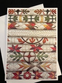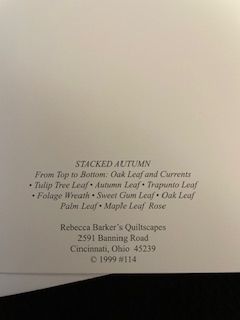 STACKED AUTUMN blank inside card w/ envelope. From Top to Bottom: Oak Leaf and Currents, Tulip Tree Leaf, Autumn Leaf, Trapunto Leaf, Folage Wreath, Sweet Gum Leaf, Oak Leaf, Palm Leaf, Maple Leaf Rose. Rebecca Barker's Quiltscapes. c1999 #114