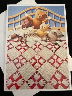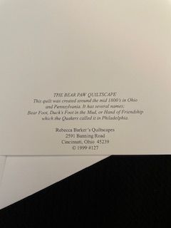 THE BEAR PAW QUILTSCAPE blank inside card w/ envelope. This quilt was created around the mid 1800's in Ohio and Pennsylvania. It has several names; Bear Foot, Duck's Foot in the mud, or Hand of Friendship which the Quakers called it in Philadelphia. Rebecca Barker's Quiltscapes. c1999 #127