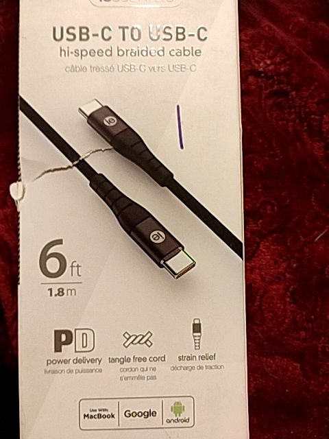 USB- C To USB- C Hi- Speed Braided Cable 6 Ft. Tangle Free Cord. Black (White Box)