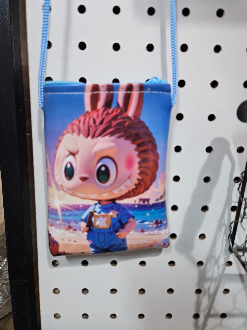 Labubu purse that is just small enough for a kid to carry their snack and maybe a juice pouch! It has a long strap for it to be perfectly put on as a cross bag.