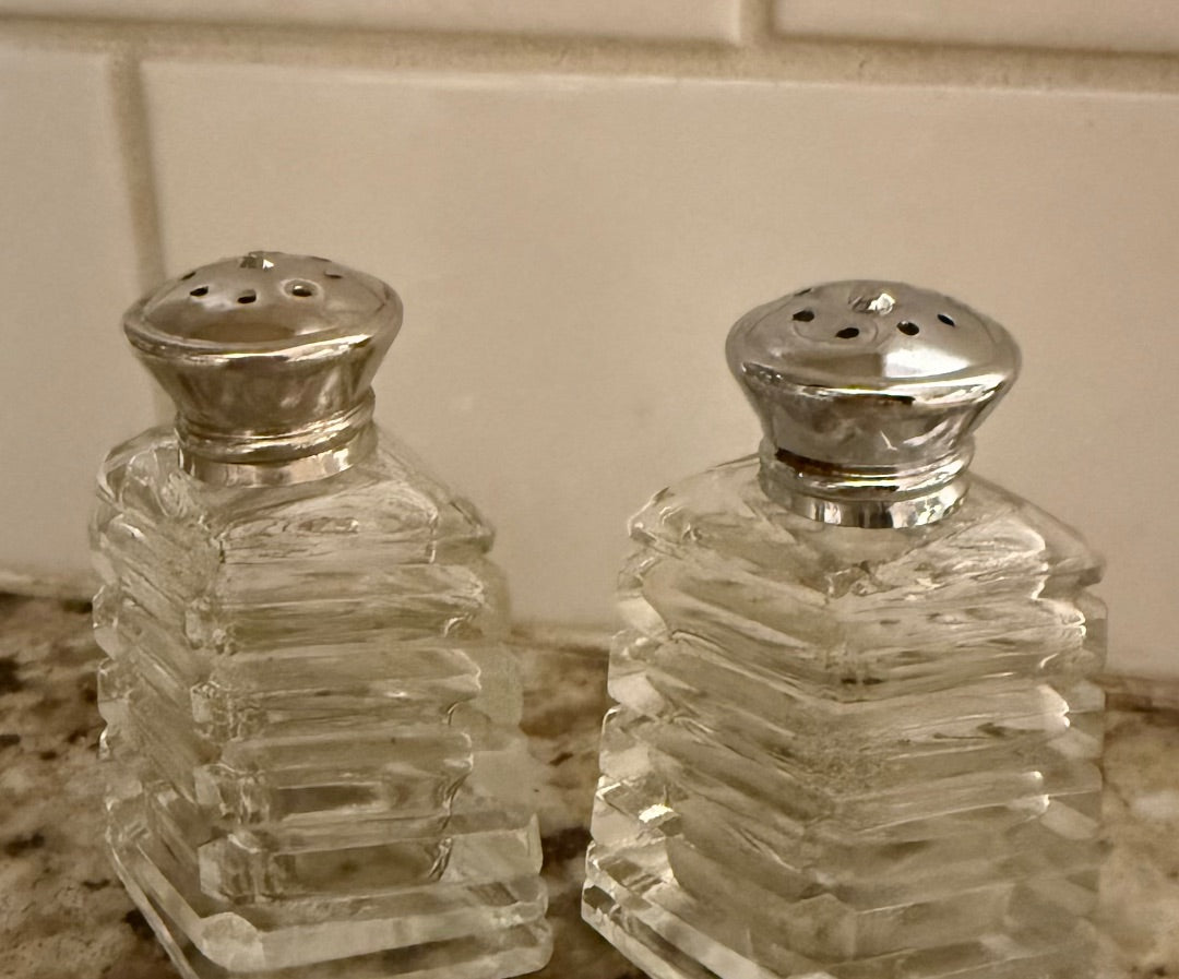 Great old Crystal S & P shakers.geometric pattern, MCM. Nice condition.