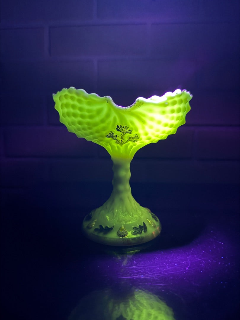 Beautiful antique Northwood custard glass jam compote. Some of the gold has worn off. this is normal for its age. The are are no chips or cracks and she glows beautifully.