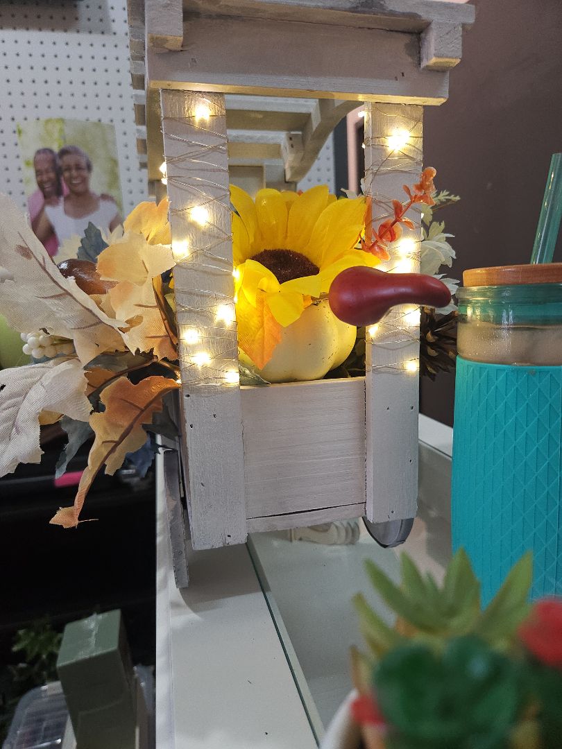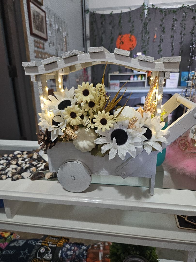 Flower cart full of fall flowers! Interchangeable flowers! Buttons for lights are marked, first battery change is provided.