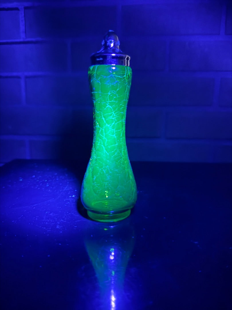 Pretty mcm Kanawha salt or pepper shaker. Green crackle glass. Some of the chrome is missing from the lid. Check the picture. No chips or cracks.