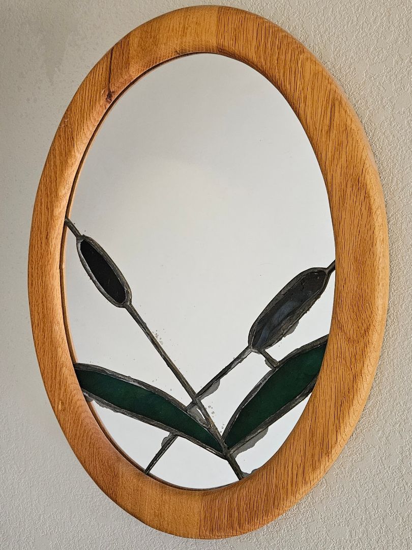 Vintage Stained Glass Oval Mirror w/ Oak Frame. 18.5" x 14.5"