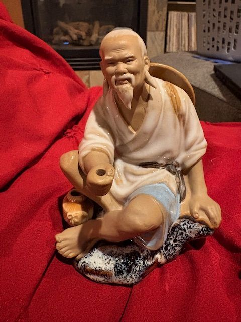 Vintage Chinese “Mudman” Incense Burner Figurine – 5.5” Ceramic Scholar with Pot