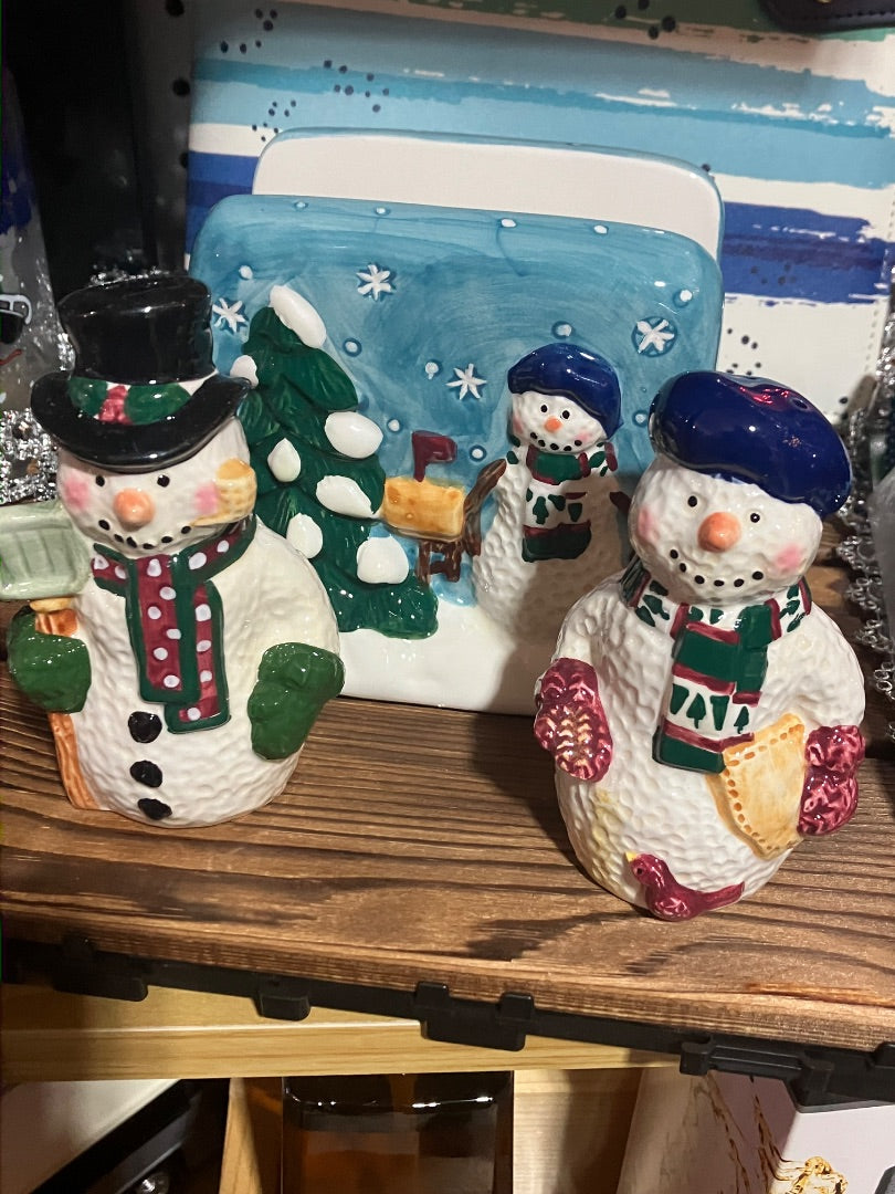 Snowmen Serenade II Hand Painted Napkin Salt & Pepper Set by Meiwa