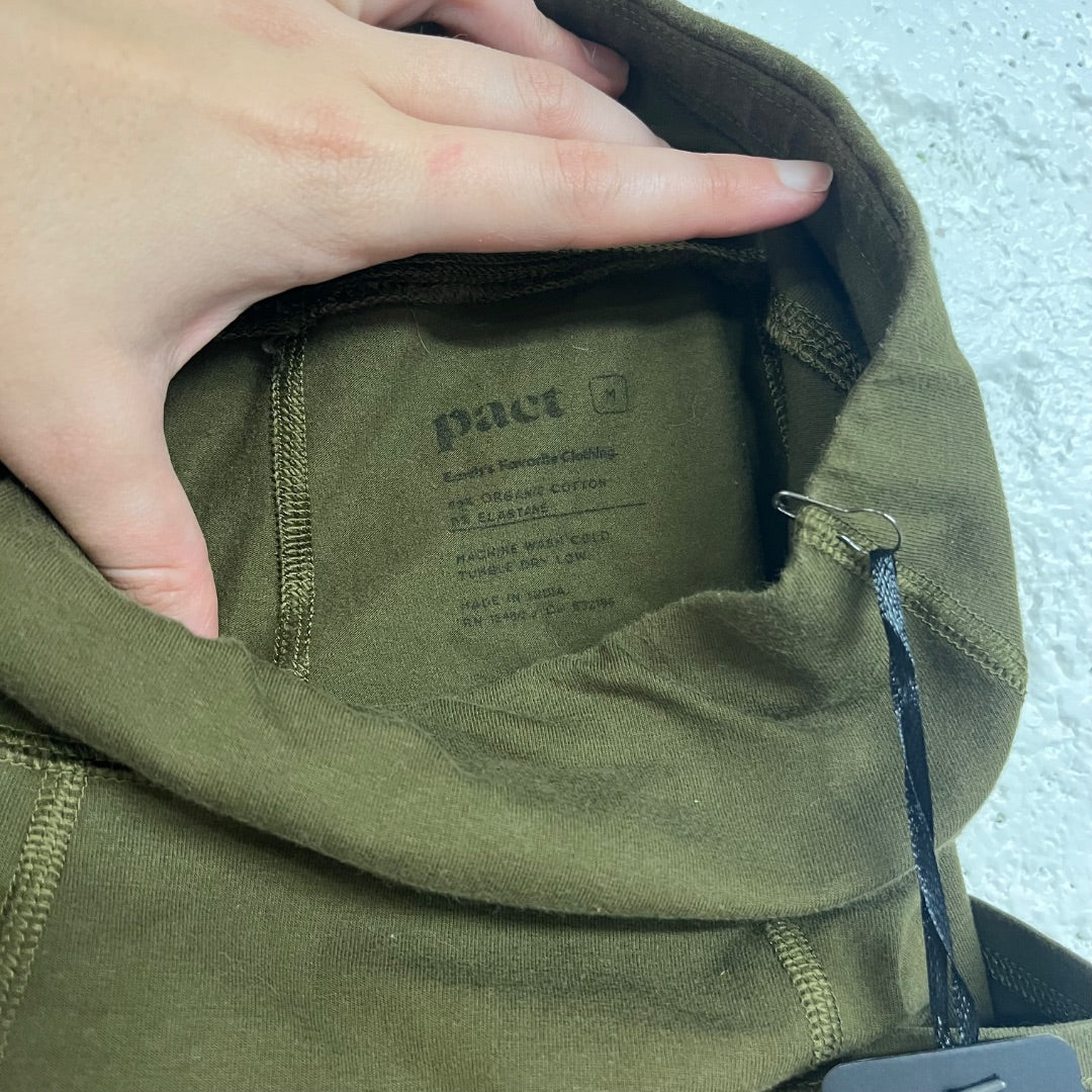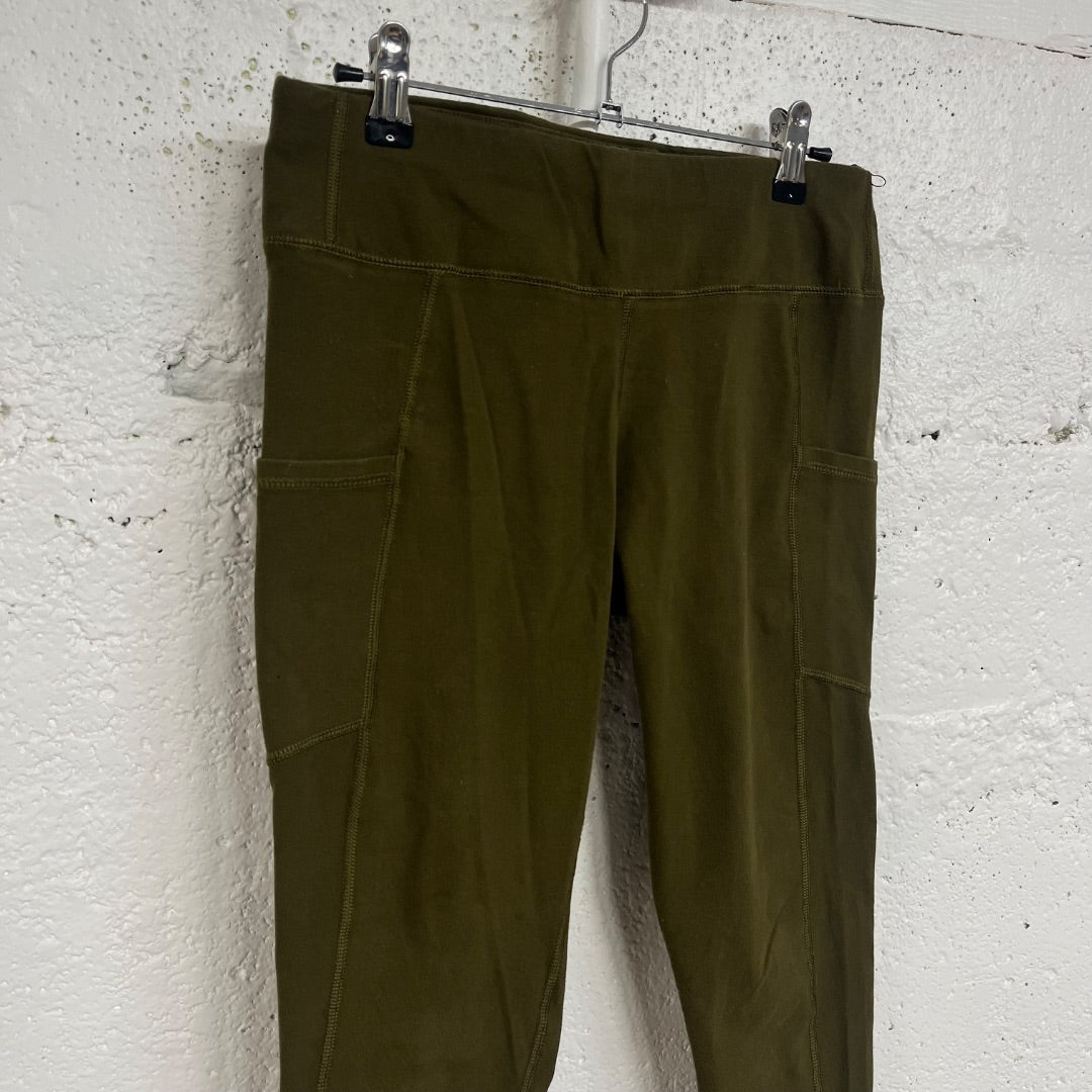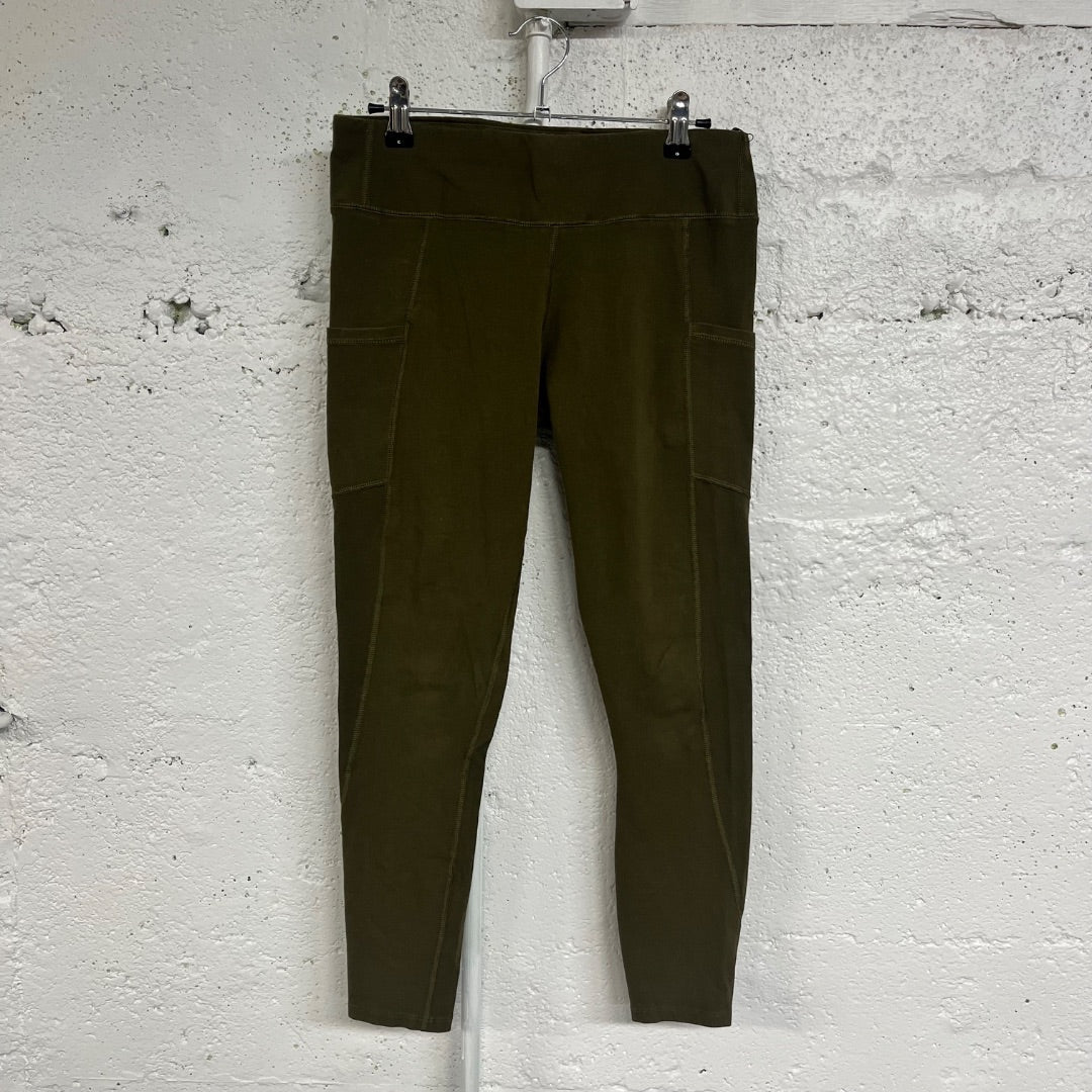 Thick, fitted stretchy cotton material; army green; two side pockets