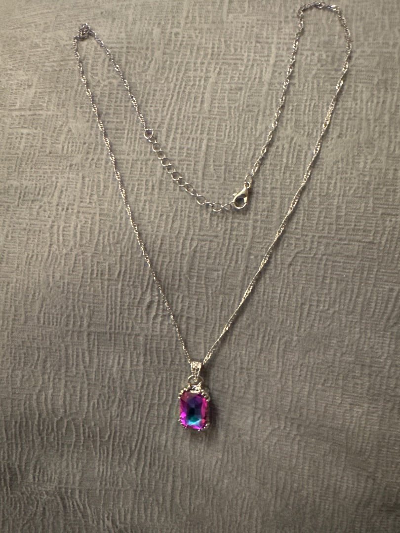 Color changing swavorski pendant on silver toned chain. Color changes from pink to purple to blue!