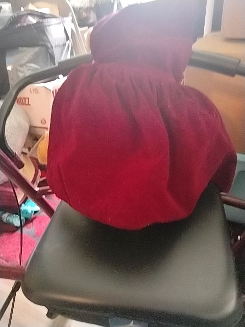 Vintage Cottage Collectibles "Honey" Teddy Bear with red and green plaid dress/burgundy cape. Attached Teddy Bear muff. Collectible