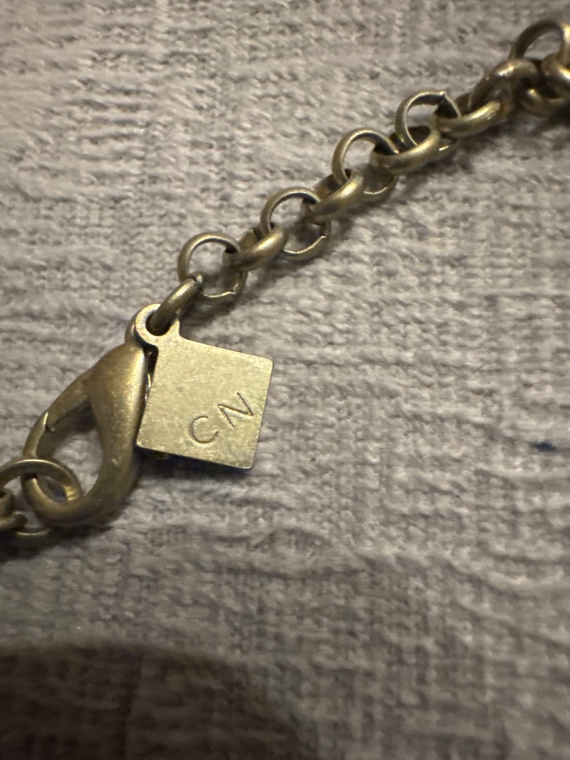 Five teal beaded tassels hang from a silver toned metal chain chain. Approximately 24 inches long.. marked CN with a makers fillagree.
