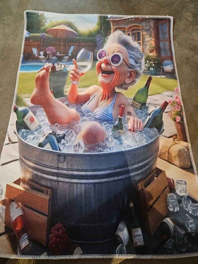 Funny, microfiber, soft towels with hilarious images of oldies ladies and their friends!