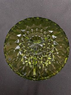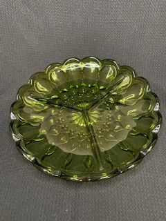 Vintage (1972-1976) Anchor Hocking Avocado Green Fairfield Pattern Divided Relish Dish. Used for appetizers, snacks, nuts, candy. ~ 8.75" diameter