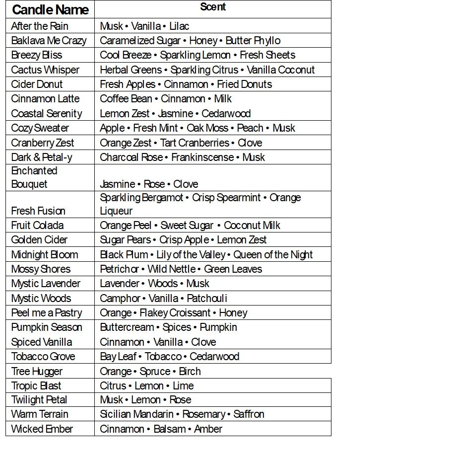 • 3oz net weight • Coconut/Soy wax blend • Lead-free cotton wick • Phthalate-free fragrance oils • Approx. 12–15 hour burn time