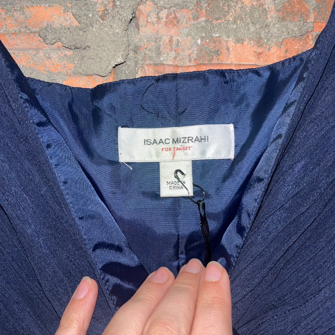 Isaac Mizrahi for Target 100% silk shell navy formal cocktail midi dress with a pleated v-neck bust and bow detail